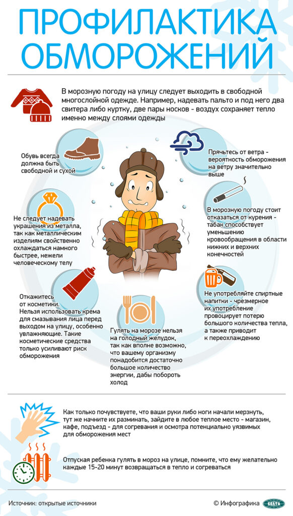 не выходите на мороз без варежек, шапки и шарфа. Лучший вариант — варежки из влагоотталкивающей и непродуваемой ткани с мехом внутри. Щеки и подбородок следует защитить шарфом. В ветреную холодную погоду перед выходом на улицу открытые участки тела смажьте специальным кремом;