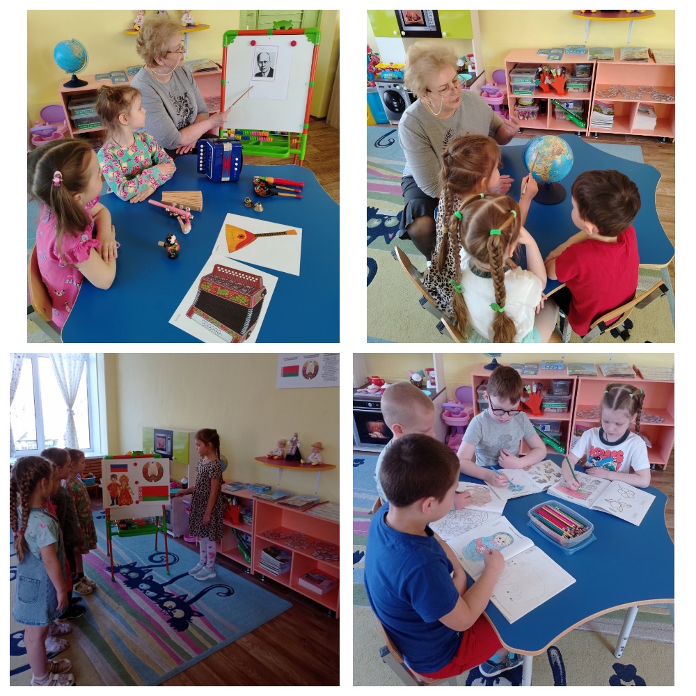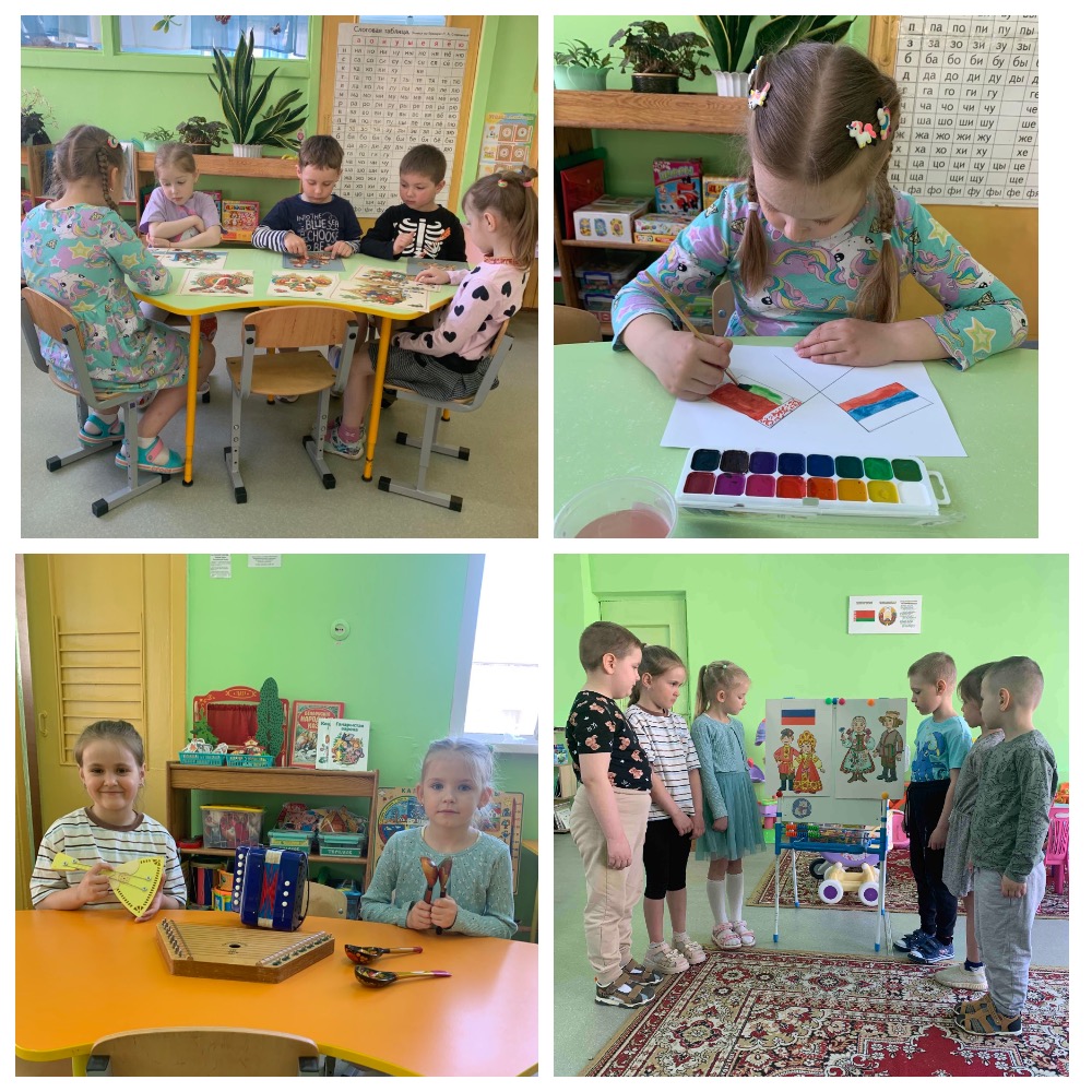 С целью формирования у детей представлений о государственном празднике, о дружбе между народами Беларуси и России, об общности истории и культуры двух стран в старших группах прошло тематическое занятие «Две сестры — Беларусь и Россия». Ребята прослушали песню В. Викторова «Дружат дети всей Земли», разучили отрывки из стихотворений Н. Гилевича «Я – белорус» и Г. Горшкова «Я – россиянин». Воспитанники познакомились с историей возникновения праздника, с государственными символами братской страны, основными достопримечательностями, читали русские и белорусские народные сказки, рисовали. Также были проведены дидактические игры «Национальная одежда», «Сравни государственные флаги», подвижная игра «Скажи по-белорусски». Дети рассматривали музыкальные инструменты, русские и белорусские национальные костюмы.